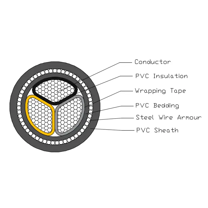 BS 6346 پاور کیبل ایک T1R کاپر کنڈکٹر، پی وی سی موصلیت، پی وی سی بیڈنگ، اسٹیل وئیر آرمر اور پی وی سی میان پر مشتمل ہے۔